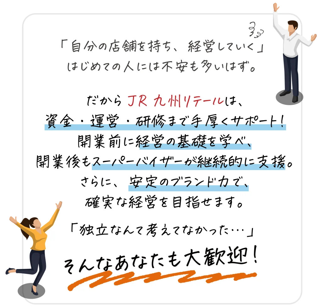 JR九州グループとしての高い信頼性があり、安定した経営基盤を築きやすいです。 また、九州地域に根差した事業展開を行っており、地域の特性やニーズを熟知しているため、顧客の支持を得やすい地域密着型の店舗運営を可能にしています。